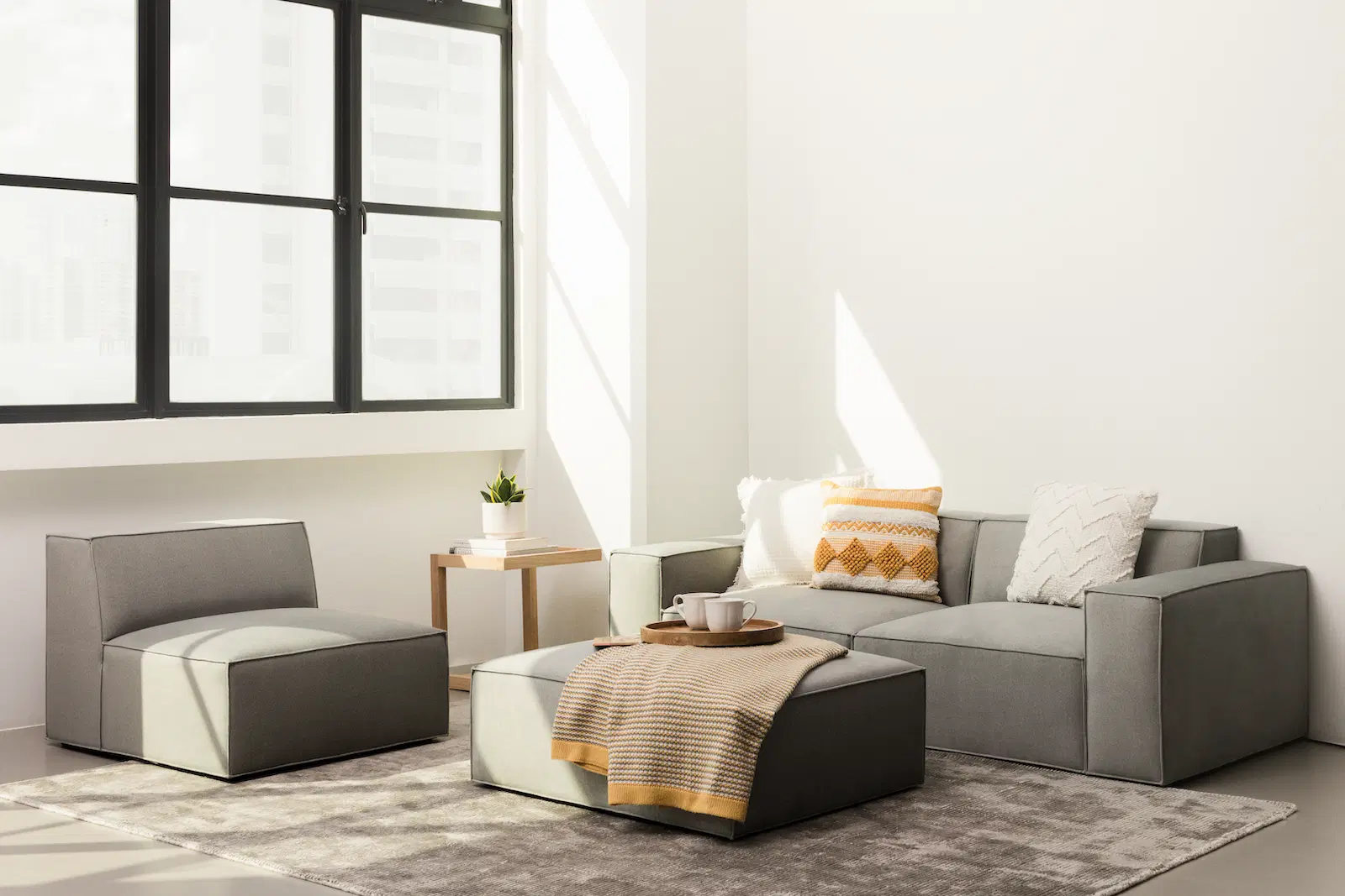 This sectional couch will add a touch of mid-century glamour to your home with its thick foam padding and pocket coil spring mechanism in the cushions. It gives your living room and lounge an opulent sitting experience. The Vitality Living Room Sectional Sofa is solidly constructed from wood and plywood, and it has non-marking foot tips to protect floors as well as connectors between modular components.