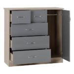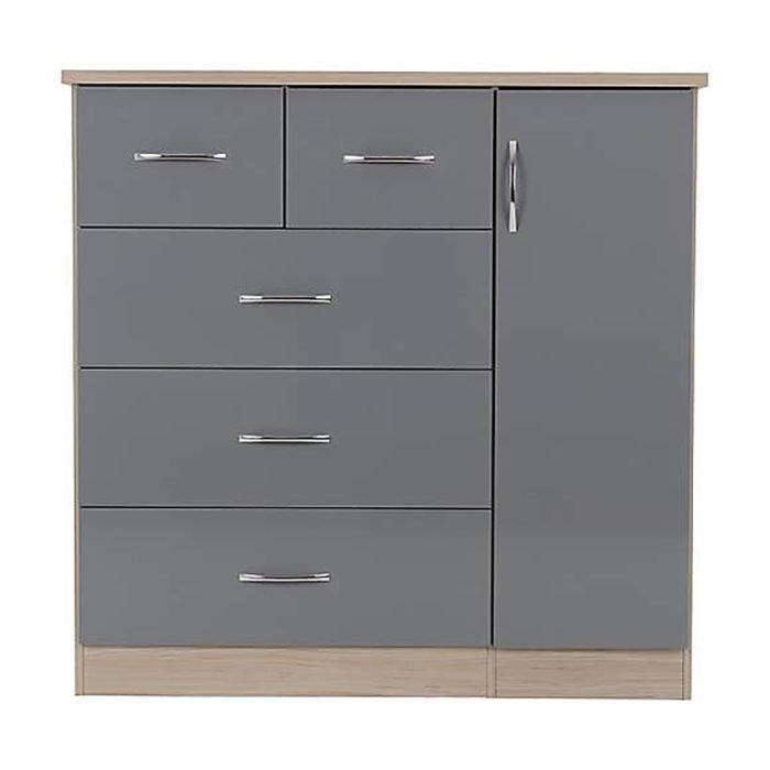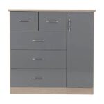 The gloss finished front of the Grey 5 Drawer Compact Wardrobe, which contrasts beautifully with the light wood veneers, gives it a modern appearance. The five drawers and hanging space on the metal rail of the Nevada will meet all of your storage requirements.