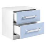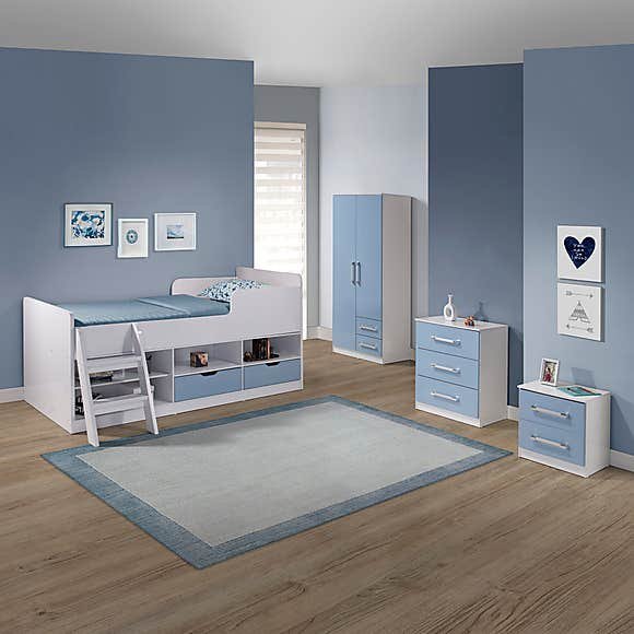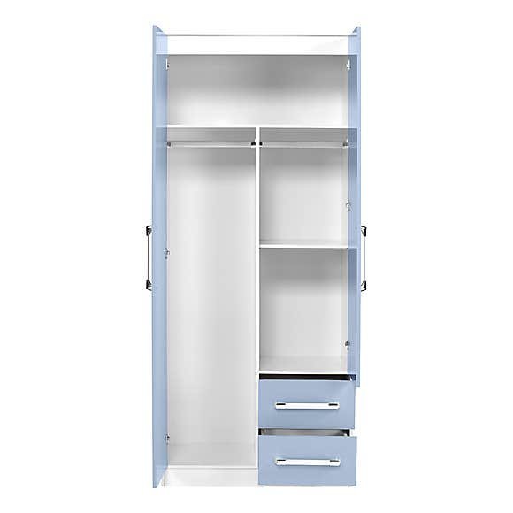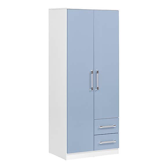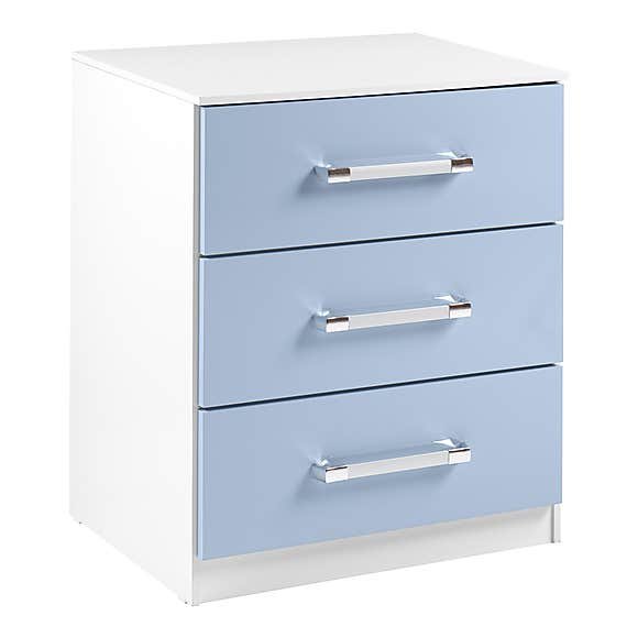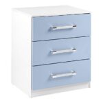 The blue Jasper bedroom set is ideal for bringing a pop of color to any bedroom thanks to its modern style. This stylish and useful set includes a three drawer chest, a three door, two drawer wardrobe, and a bedside table with two drawers. It also has lovely chrome knobs.