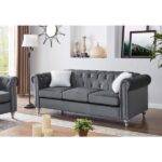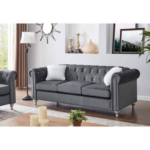 The Velvet Tufted Sofa is sure to bring the perfect touch of style to your living room. The sofa boasts jewel accent nail heads in a modern and contemporary style. The beautiful finish and design details make this piece the perfect addition to your home. The high-quality craftsmanship of this sofa is sure to be enjoyed for seasons to come. Create your perfect space with this sofa.