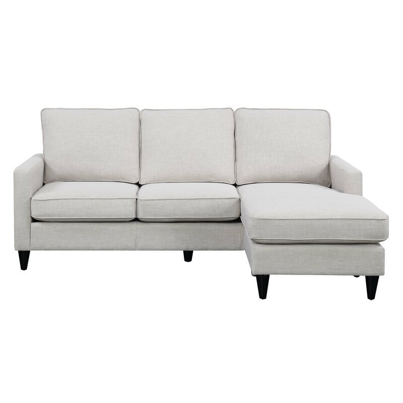 This sectional’s straight arms, simple lines, and tapered legs give it a modern look. The frame of this side-facing sofa is composed of machined, solid wood, and foam padding. Its upholstery is made entirely of polyester fabric for a casual and hospitable appearance. Despite the sofa’s contemporary style, the sectional’s neutral color allows it to complement a wide range of decor styles.