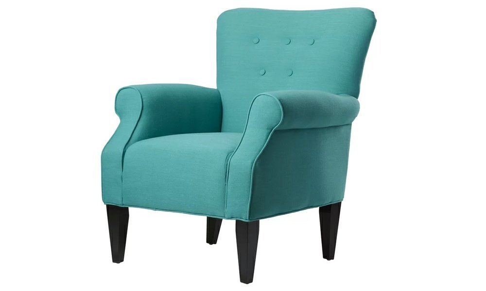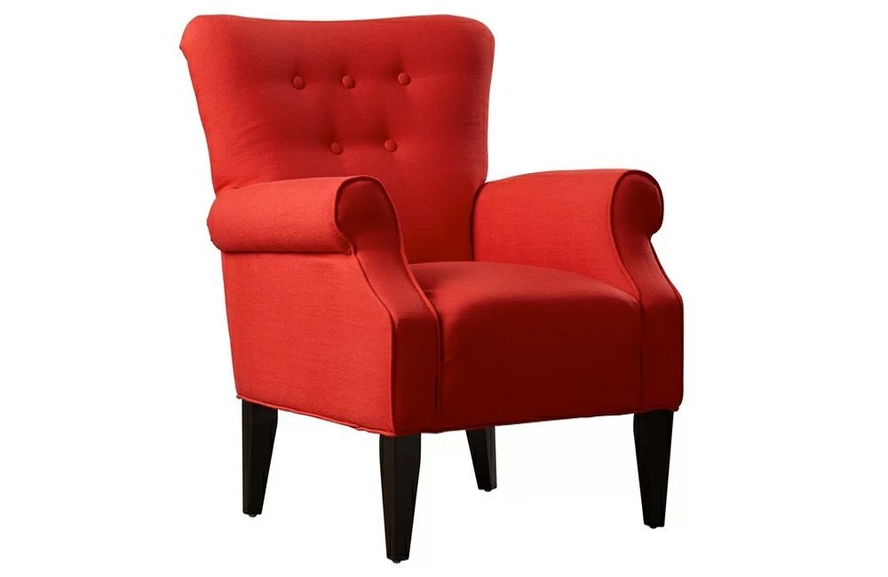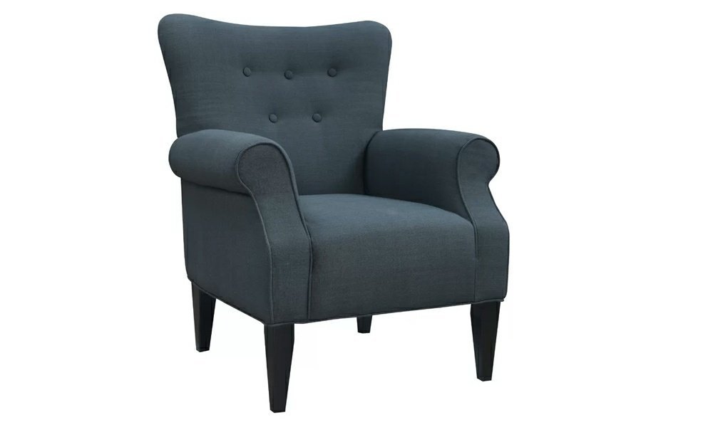 The chair has a flared arm design that is transitional and is upholstered in a plush fabric of a varied color. This chair has a tufted back and a simple, plush seat and back. This essential arm chair will add life to any room thanks to its eye-catching fabric and button tufting.