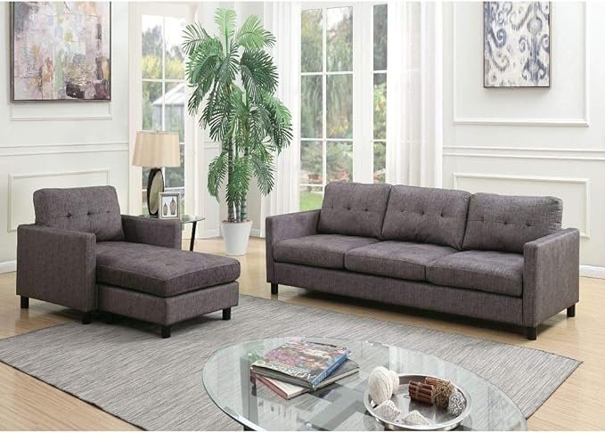 This gray-upholstered sofa will give your living room a modern and comfortable feel. Track arms, a loose back and seat cushion, squared legs, and a multi-purpose ottoman are all included, which can convert the couch into a sectional or the chair into a chaise lounge. Providing you with a comfortable environment for entertaining guests and family.