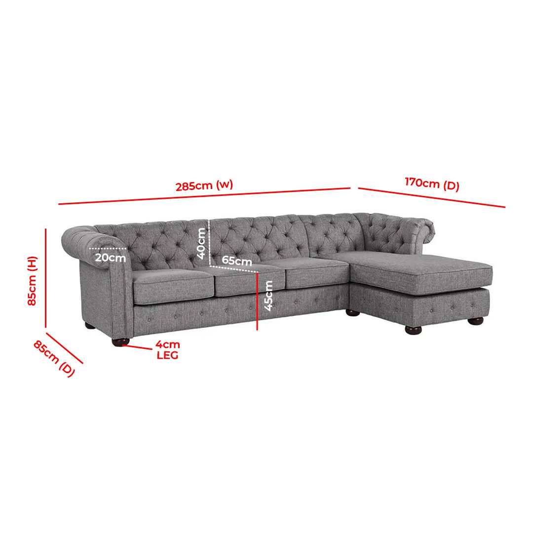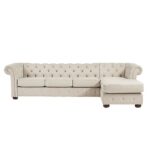 Comfort’s four-seat couch and chaise allow you to furnish your living area with plush seating. Button tufting on the low, rolling back, and arms gives the design a hint of traditional refinement. Either facing left or right, the chaise is perfect for unwinding with a book or a TV show. Upholstery made of linen is available in beige, grey, or dark grey. Arms and backs were tufted and rolled.