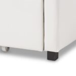 - Over a cushioned frame, the upholstery is white imitation leather.