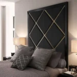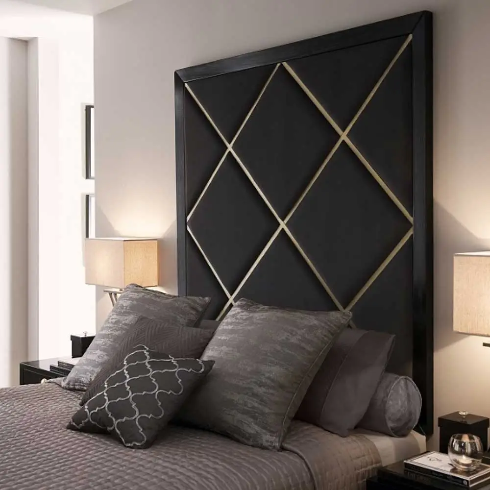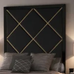 With its robust construction and understated design, this bed will enhance any space. This stunning framed headboard with gold inserts and a geometric design was painstakingly made by hand using prefabricated wood and separately upholstered panels. Oak, Wenge, Walnut, Mirror, and additional paint colors are among the finishes that are available upon request.