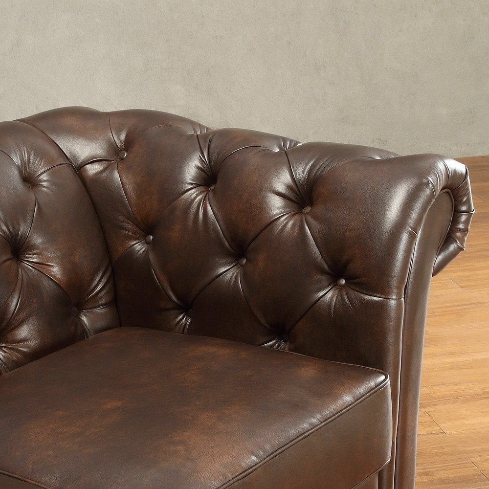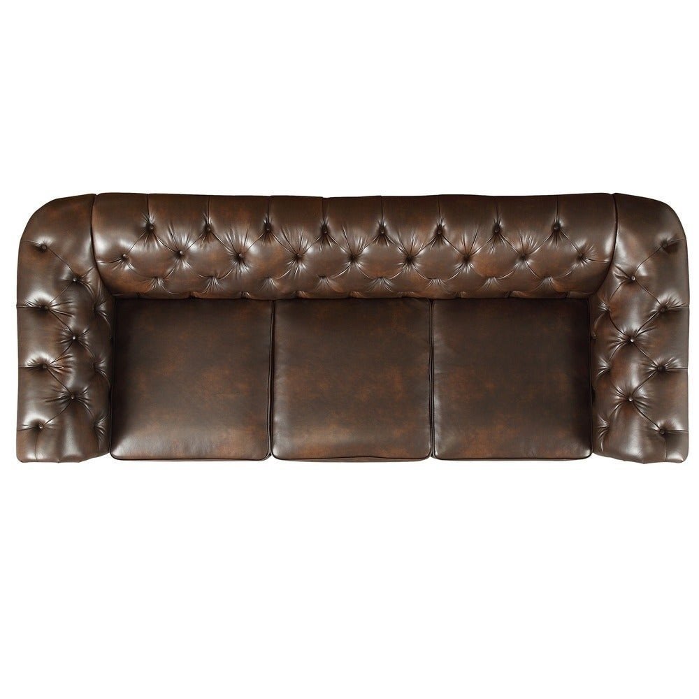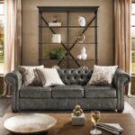 The sophisticated brown PVC leather couch is ideal for relaxing. The timeless style of the enormous sofa adds a unique touch of luxury to a large living area. The brown PVC leather or microfiber upholstery with button tufting, curled arms, and an opulent appearance is ideal for traditional design themes.