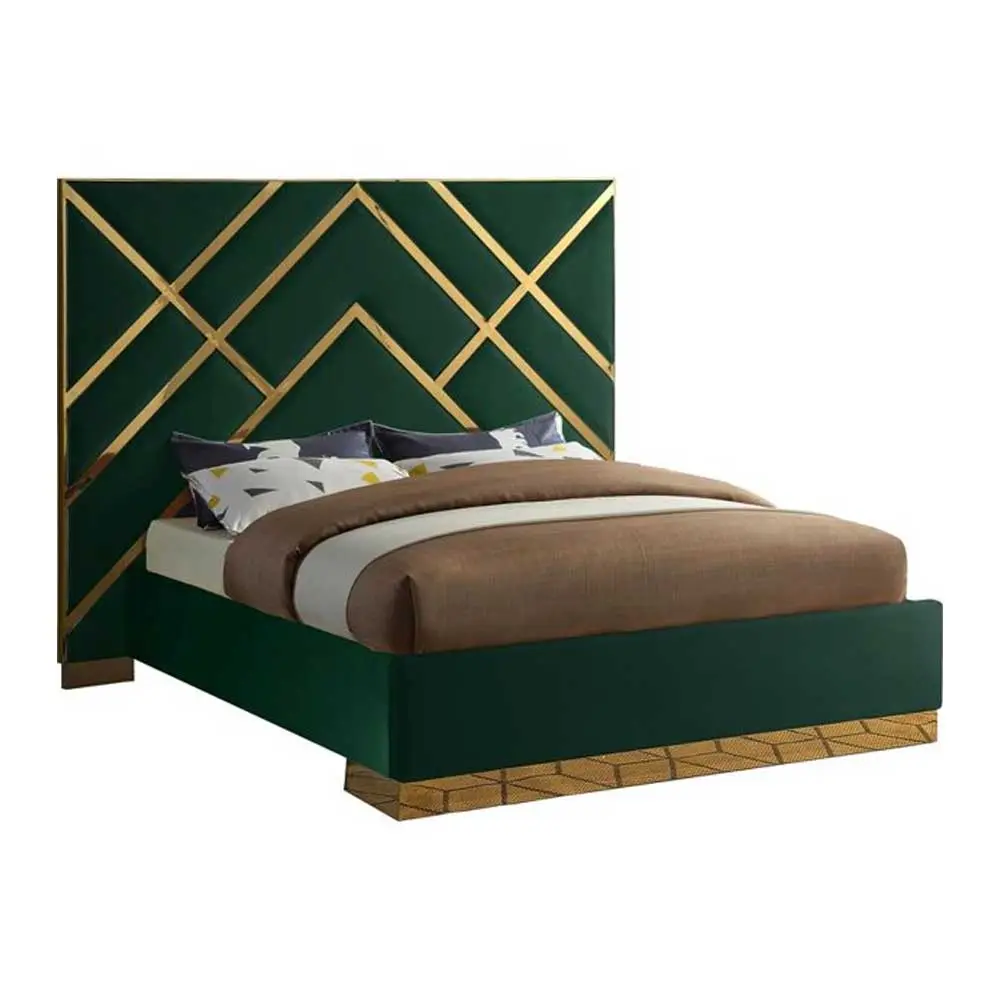 The chic and opulent velvet-upholstered bed will transform your bedroom. This bed radiates elegance and luxury with its luxurious green velvet upholstery and polished gold metal geometric design and base. You will not need a box spring or foundation to achieve this stylish look because full slats are included. Add a glamorous touch to your bedroom with this amazing contemporary bed.