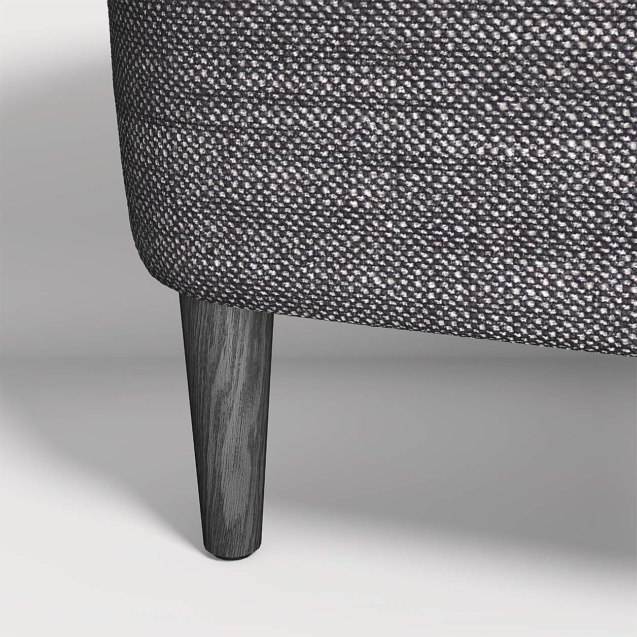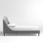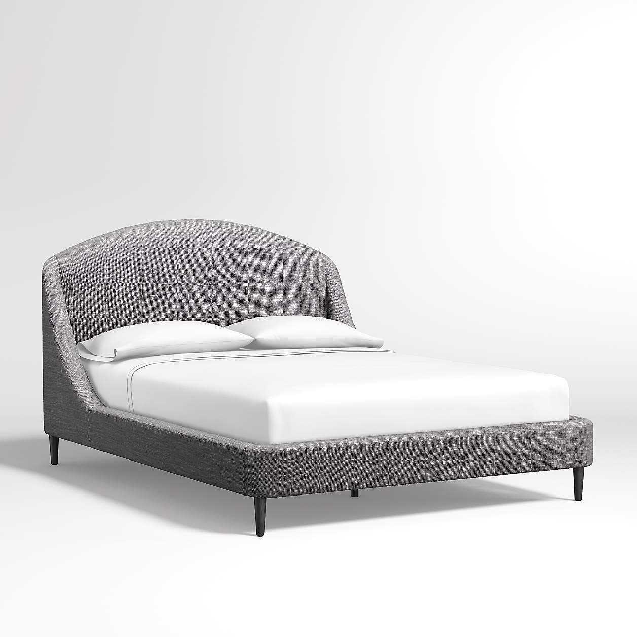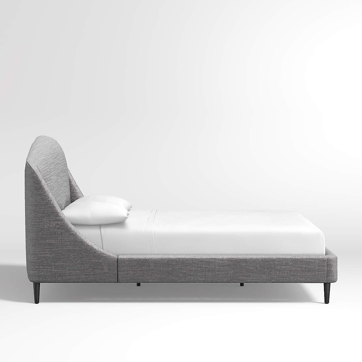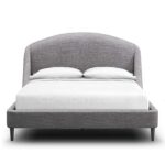 The luxurious contours of a French-style chaise are streamlined into an upholstered bed for the contemporary bedroom. The bed flows down from the softly rounded headboard to thin rails that delicately slope to form the lower-profile footboard. The bed is entirely upholstered in a misty linen-like fabric. The grey finish on the turned, solid wood legs matches the fabric and keeps the design looking new and contemporary.