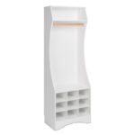 With this compact wardrobe with shoe storage, you can conveniently store both your clothing and shoes. The open wardrobe has modern-looking contoured edges, and thanks to its simple construction, it can fit in small areas. The wooden pole is for hanging coats, shirts, and scarves. The nine shoe cubbies below are for storing shoes. The top of the closet features an additional shelf that is ideal for hats, gloves, spare keys, and other items.