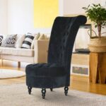 This elegant accent chair will enhance your decor. The chair adds a stunning character to any room with its tall, scrolled, button-tufted backrest, and it is comfortable thanks to its soft velvet fabric and generous padding. The chair may also be used as an ottoman for versatility, and the sturdy birch construction guarantees long-lasting beauty and support.