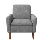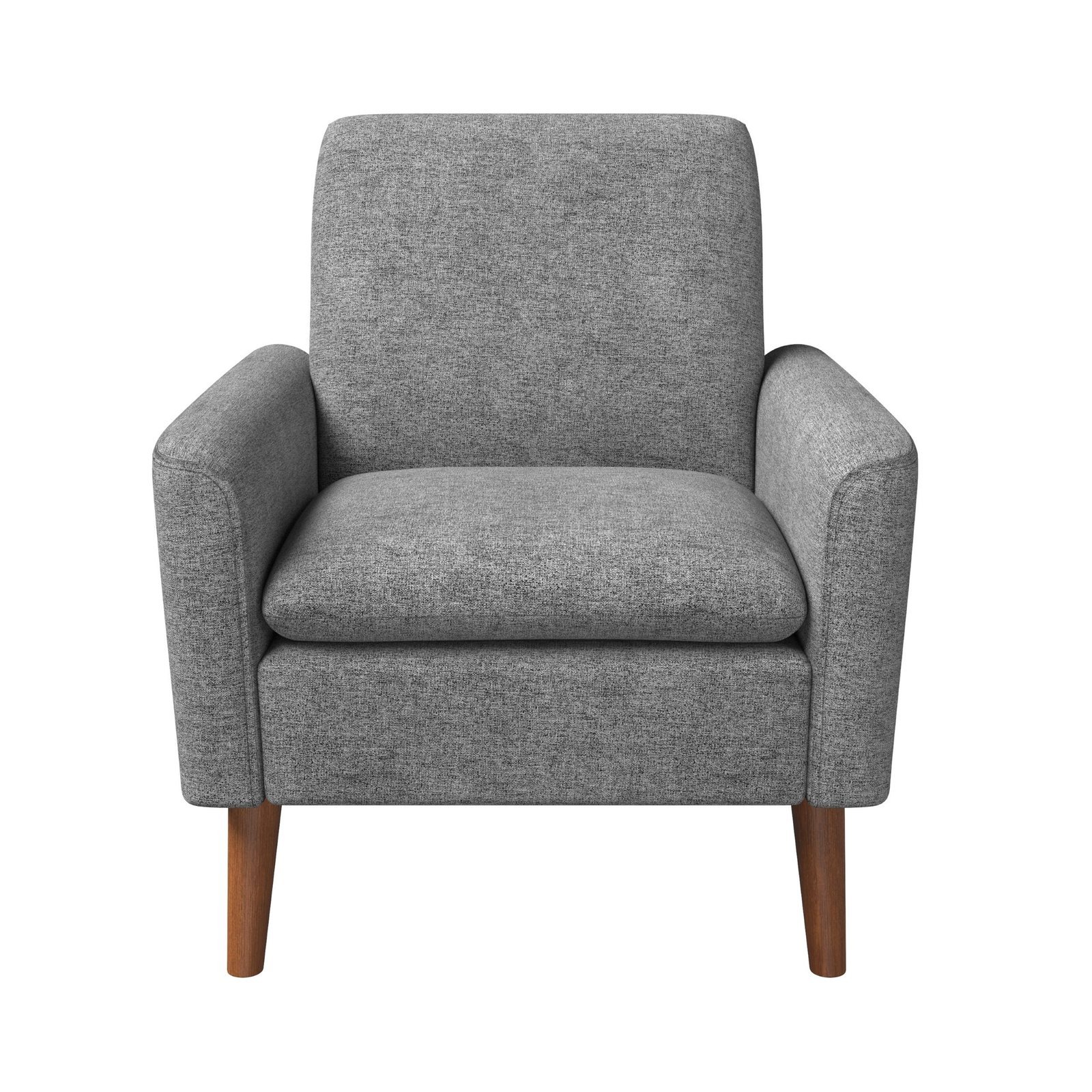 This contemporary arm chair, which oozes mid-century design, features soft, comfy seats covered in a tough, easy-to-clean polyester fabric. Walnut-finished angled legs add to the fashionable retro-modern design of today. Available in Blue, Grey, or Goldenrod as a selection.