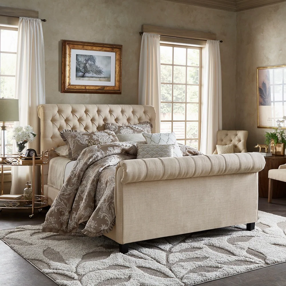 Sleep in comfort with this upholstered queen bed. Available in your choice of a grey velvet, white velvet, or sand linen-look fabric upholstery, the bed features a button-tufted design and a fully upholstered frame. The headboard is comfortably padded, creating a cozy retreat, while the bed is crafted of solid wood.