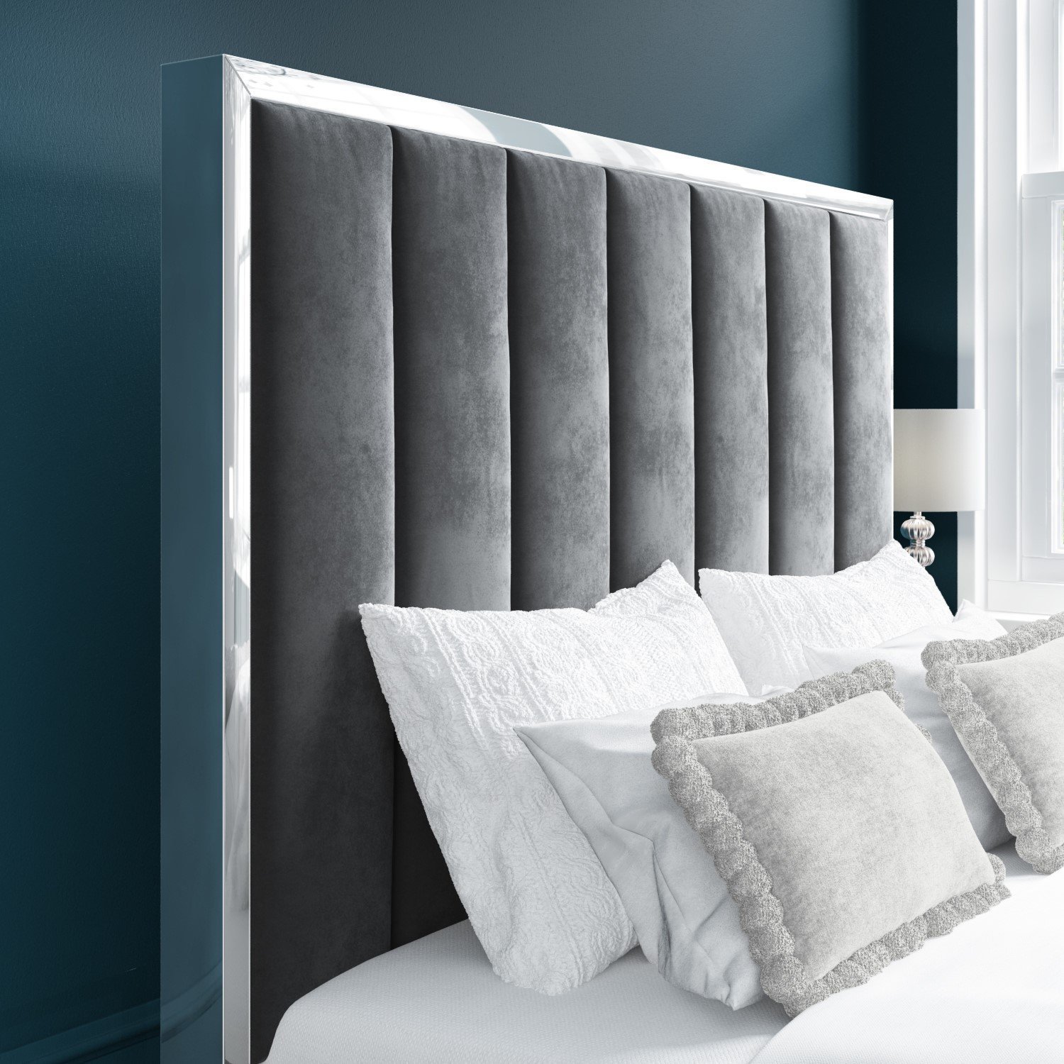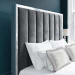 - A lavish double ottoman bed featuring a particularly tall headboard