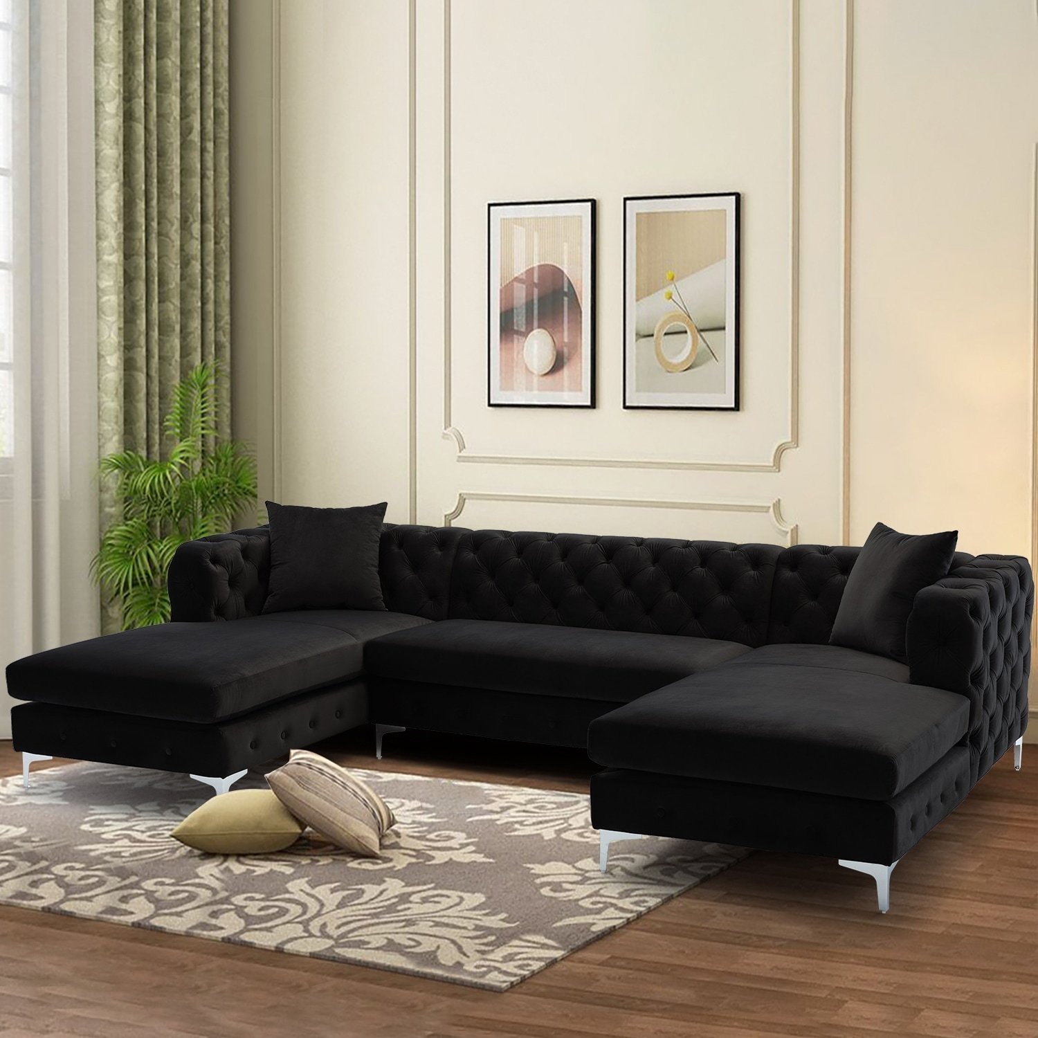 With this U-shaped sectional couch, you may comfortably host friends and visitors. The sofa has loose back cushions and ultra-soft, long-lasting velvet upholstery. To help you choose the perfect color for you, the couch is offered in a variety of hues. Large chaise loungers on both sides are ideal for relaxing while watching a movie.