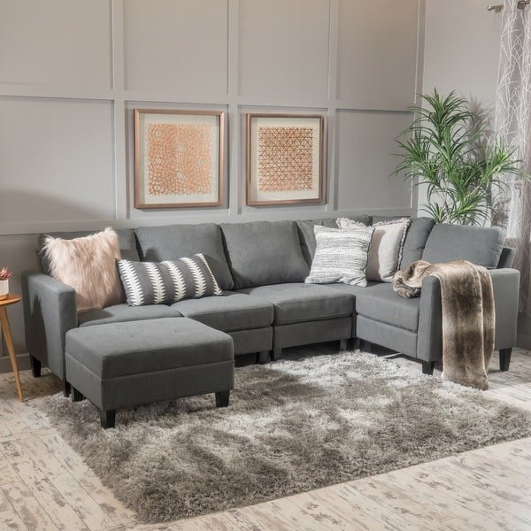 Create a wonderful retreat in your home with this spacious and versatile sectional sofa. The furniture is modular for flexible design, and it includes an ottoman to support your feet. A charming, welcoming seat that your guests and family will appreciate is made with extra plush cushions and soft fabric in your preferred colors.